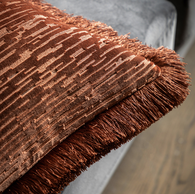 A luxurious textured velvet cushion in a beautifully rich tone, with soft fringed trim.