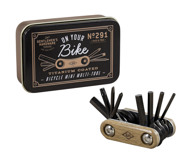 Bicycle mini Multi-Tool stored in a wooden handle grip and packaged in a vintage style tin.
