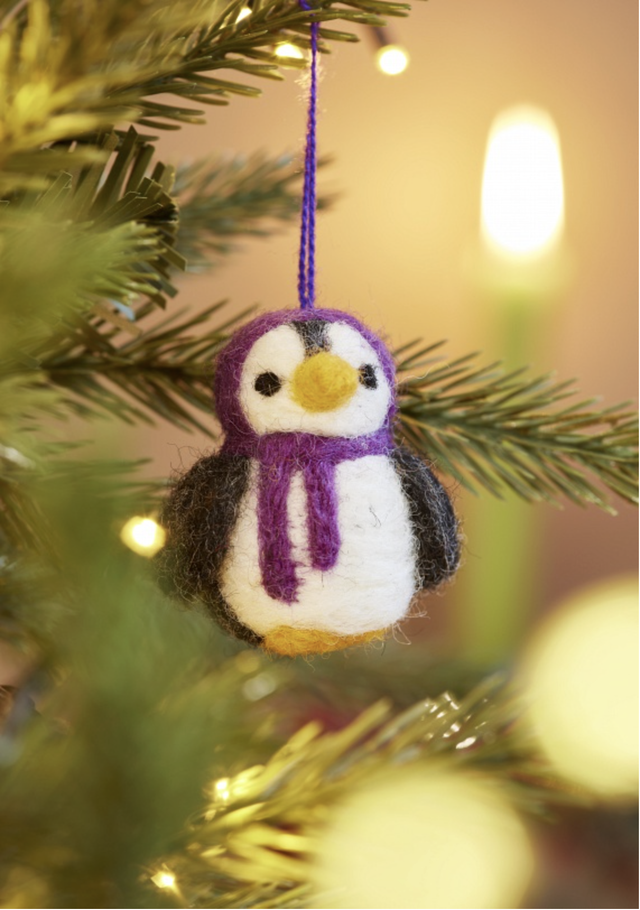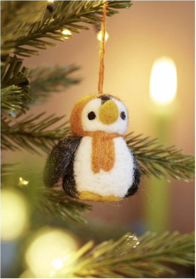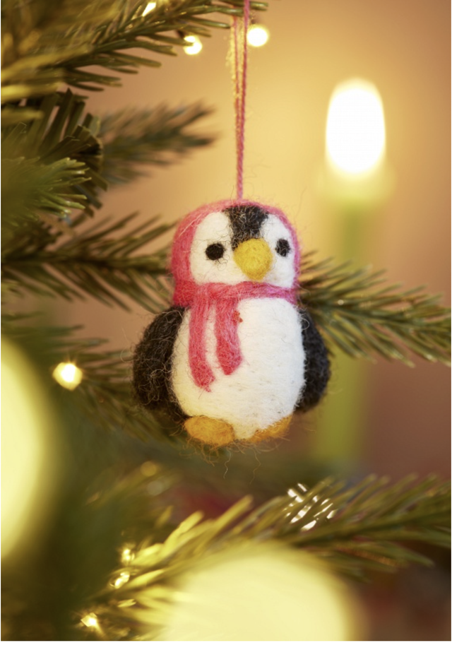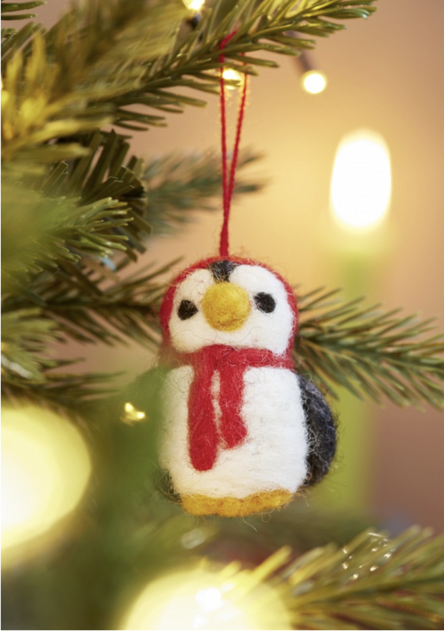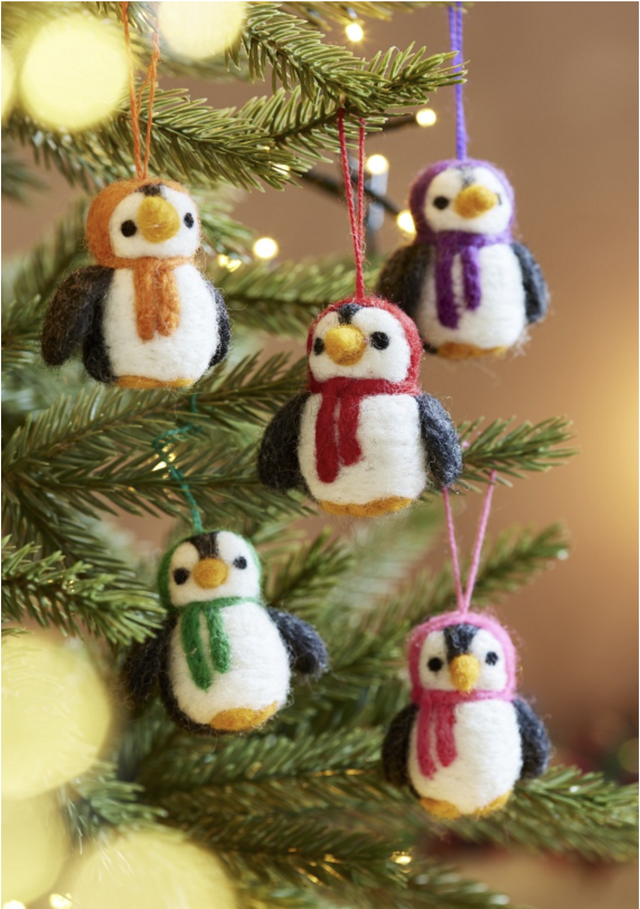Adorable Christmas felt penguin tree decorations wearing winter clothing and complete with a hanging thread for easy display.