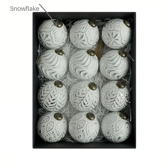 Striking white and silver Christmas baubles in 4 different designs.